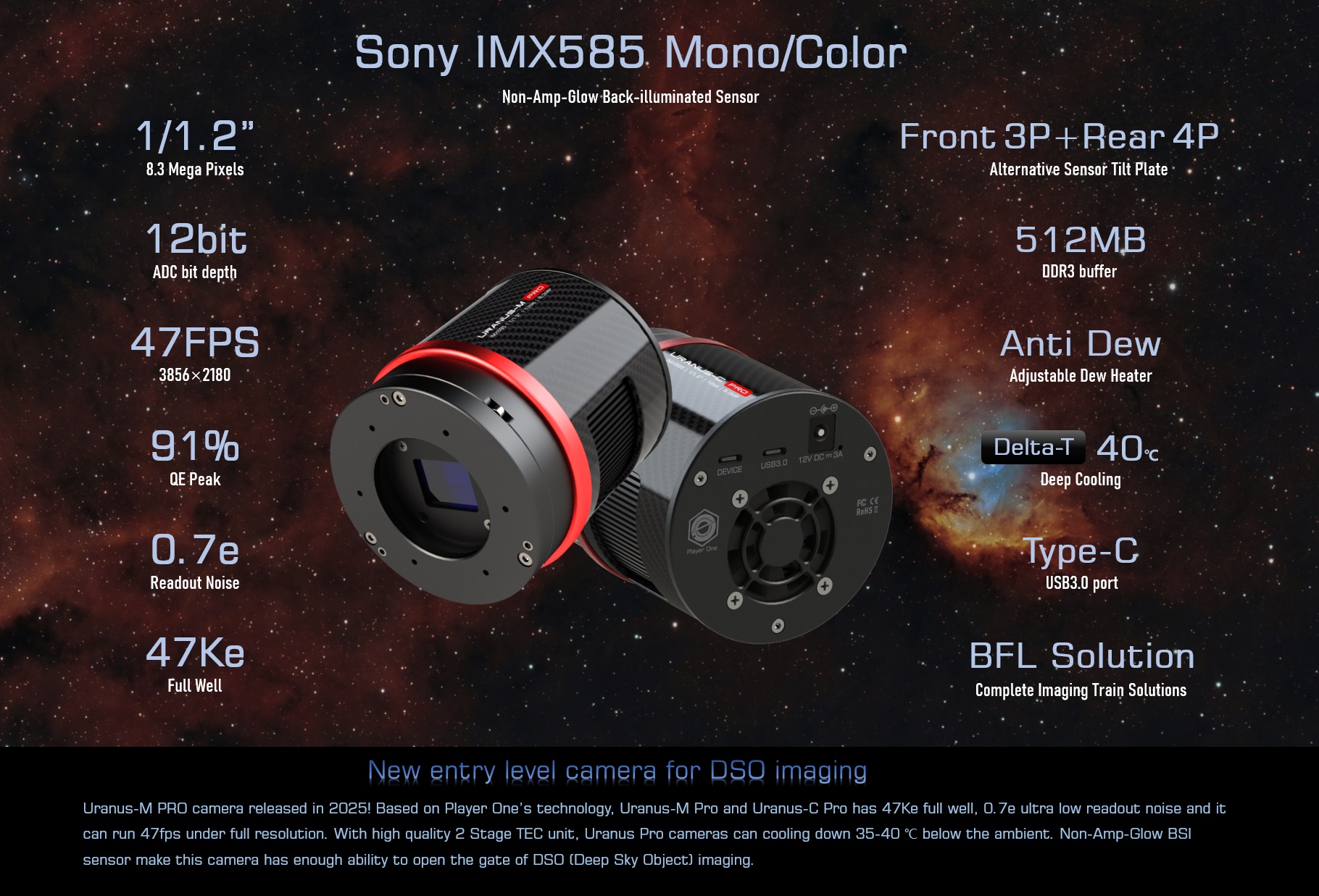 Player One Astronomy è l'unico produttore ad avere in catalogo la versione raffreddata dell'ottimo sensore Sony IMX585! La Uranus-C Pro ha pixel da 2,9nm e una full well capacity di 47ke con un totale di 8,3MP (3856*2180) ed una diagonale di 12,85mm