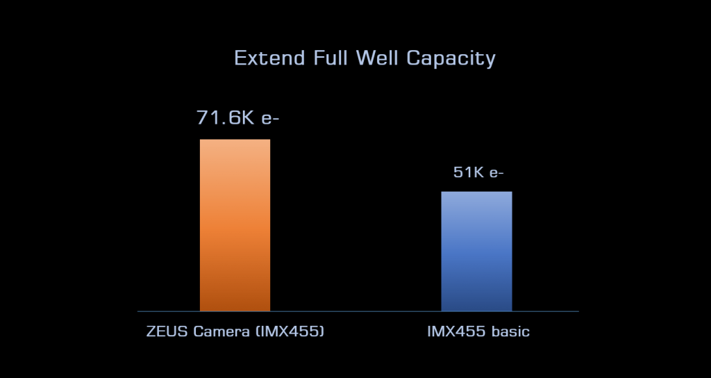 La camera ha una grande full well capacity di 71,6ke che è decisamente maggiore del valore base del sensore IMX455 (51ke)