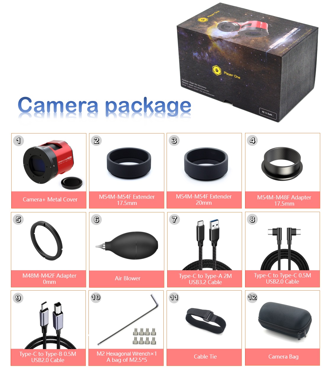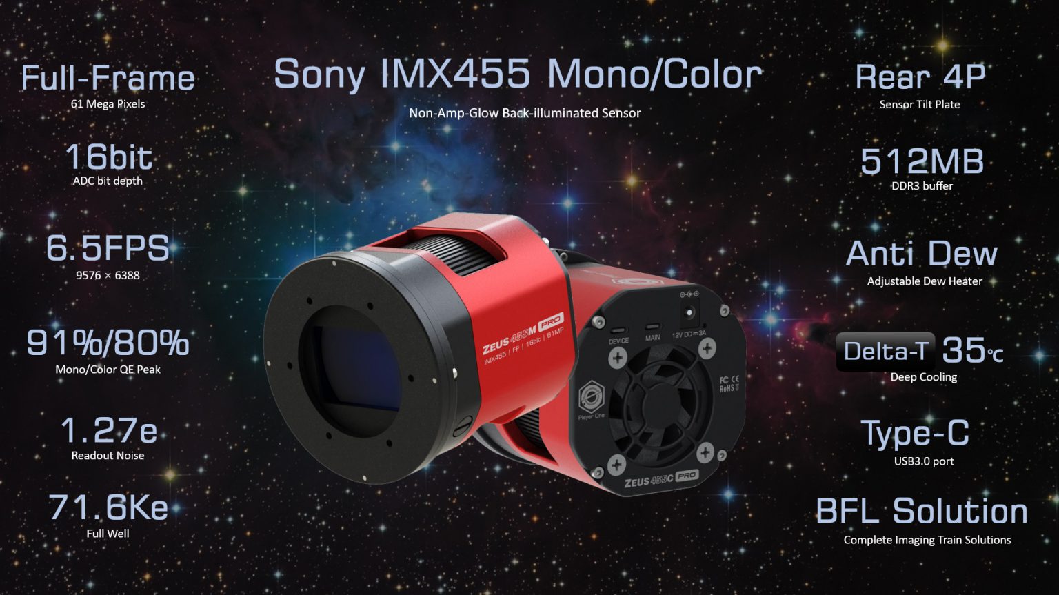 Nuova eccezionale camera raffreddata di Player One Astronomy con sensore Sony IMX455 Full Frame in bianco e nero, pixel da 3,76 e una full well capacity di 71,6ke con un totale di 61MP (9576x6388) ed una diagonale di 44,3mm