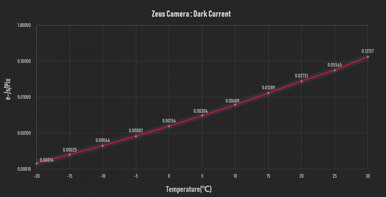 La corrente di buio è di soli 0.000105 e/s/pix a -20℃, e 0.001178e/s/pix a 0℃. In tutta la curva la corrente di buio è praticamente come una linea dritta, questo prova che la camera Poseidon è di ottima qualità!