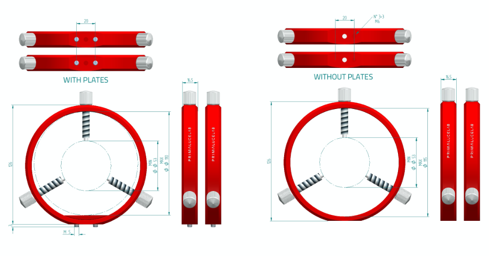 Gli anelli di guida 115mm PLUS sono parte del nostro sistema PLUS (Prima Luce Universal System) che comprende molte altri anelli di guida, anelli di supporto, piastre e morsetti per offrirvi la massima libertà nel costruire il vostro sistema meccanico di supporto, in funzione dell'applicazione che volete realizzare. Infatti tutti gli elementi PLUS presentano fori filettati, fori passanti e asole adatti per collegare gli elementi tra di loro, sempre con massima rigidità e comodità.