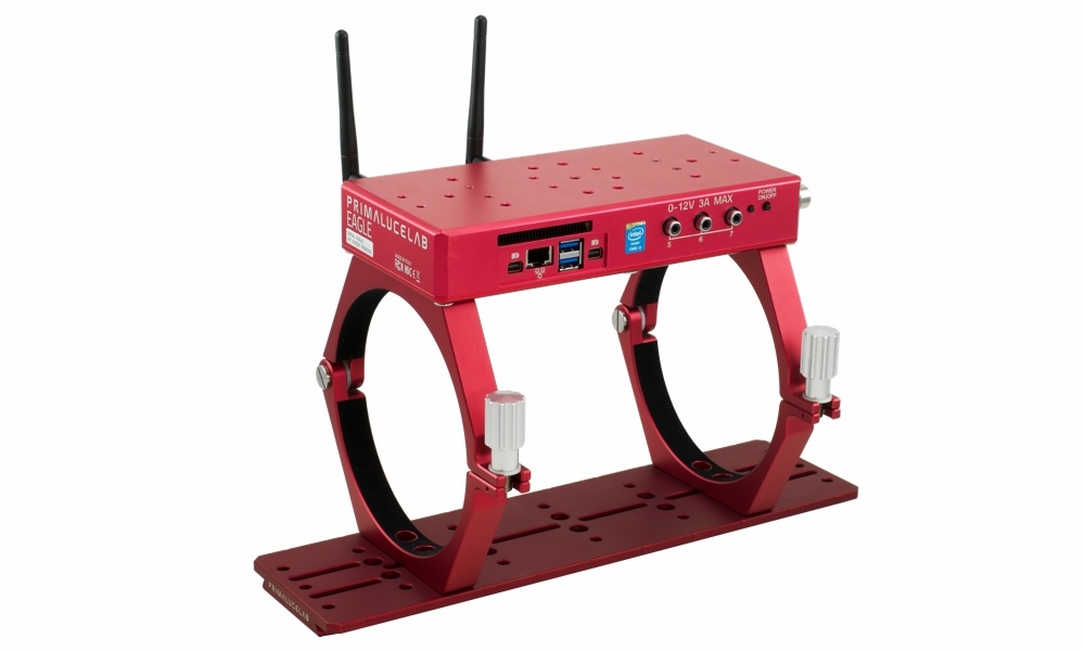 Nell'immagine sopra, la piastra stile Losmandy 350mm PLUS installata sotto agli anelli di supporto PLUS da 145mm di diametro. Sopra agli anelli è installato EAGLE. Se disponete di accessori meccanici di altre marche, potete comunque utilizzare tutti gli elementi del sistema PLUS. Infatti abbiamo previsto una serie di asole centrali che consentono, ad esempio, di fissare su questa piastra gli anelli di supporto o di guida tramite una vite.