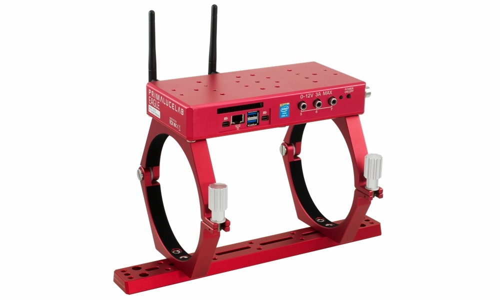 Nell'immagine sopra, la piastra stile Vixen 350mm PLUS installata sotto agli anelli di supporto PLUS da 145mm di diametro. Sopra agli anelli è installato EAGLE. Se disponete di accessori meccanici di altre marche, potete comunque utilizzare tutti gli elementi del sistema PLUS. Infatti abbiamo previsto una serie di asole centrali che consentono, ad esempio, di fissare su questa piastra gli anelli di supporto o di guida tramite una vite.
