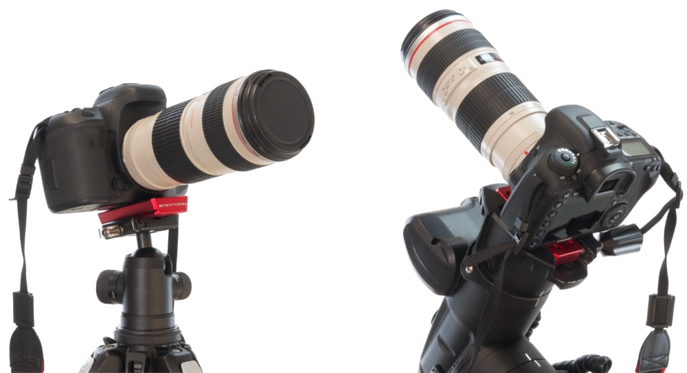 Piastra stile Vixen 90mm PLUS installata sotto a una camera: in questo modo è possibile installare la camera su una testa fotografica (a sinistra) o su una montatura (a destra), come se fosse un telescopio.