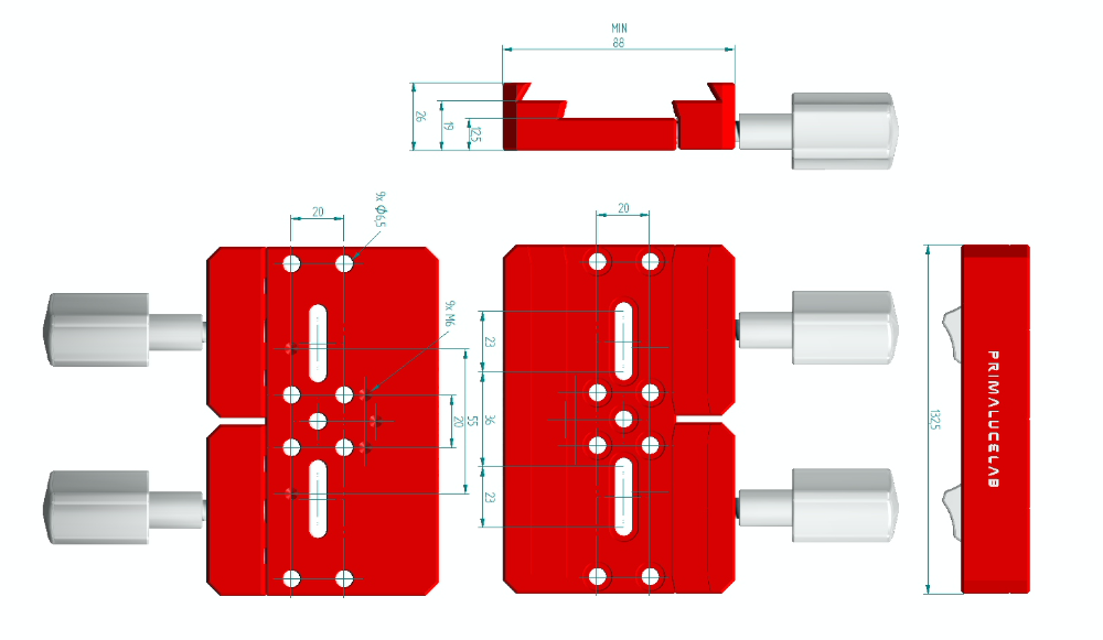 1. installati (2 morsetti) su una qualsiasi delle nostre piastre di supporto PLUS per realizzare una piastra doppia (che consente di installare due telescopi in parallelo sulla stessa montatura). Grazie alla presenza di tutti i necessari fori filettati, è possibile realizzare piastre doppie sia con attacco sulla montatura con piastra Vixen o Losmandy.
