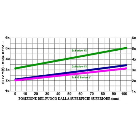 Per gli astrofotografi di seguito è riportato uno schema che indica il potere di ingrandimento di ogni Barlow in funzione della distanza della superfice superiore della stessa dal sensore o pellicola.