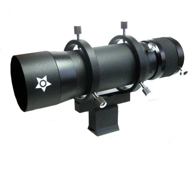 Cercatore 60/228mm Tecnosky su anelli disassabili, versione senza oculare con reticolo illuminato ed utilizzabile come piccolo telescopio portatile o come telescopio guida.