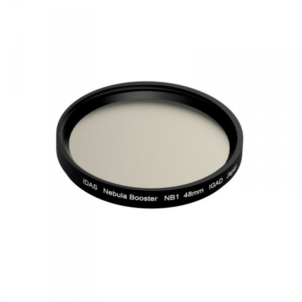 Filtro interferenziale IDAS Nebula Booster versione 1 (NB1) da 2" / 48 mm montato in cella per camere a colori progettato per enfatizzare le regioni nebulari su camere a colori (OSC). Il filtro lascia passare le due regioni di emissione nebulare principali (H-beta - OIII e H-alpha - NII) con una trasmissione totale di circa il 98%. Particolare attenzione è stata data alla soppressione di riflessi indesiderati attorno alle stelle più luminose. Inoltre incopora una filtratura nell'infrarosso fino a 1100 nm circa.