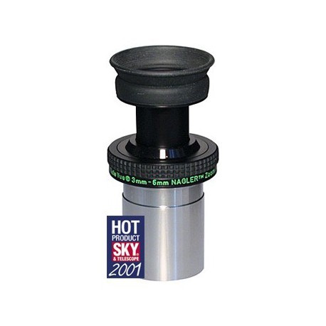 Oculare TeleVue Nagler zoom click-stop con focale variabile da 3 mm a 6 mm. E' composto da 5 lenti ed ha un campo apparente di 50° COSTANTE per tutte le focali.