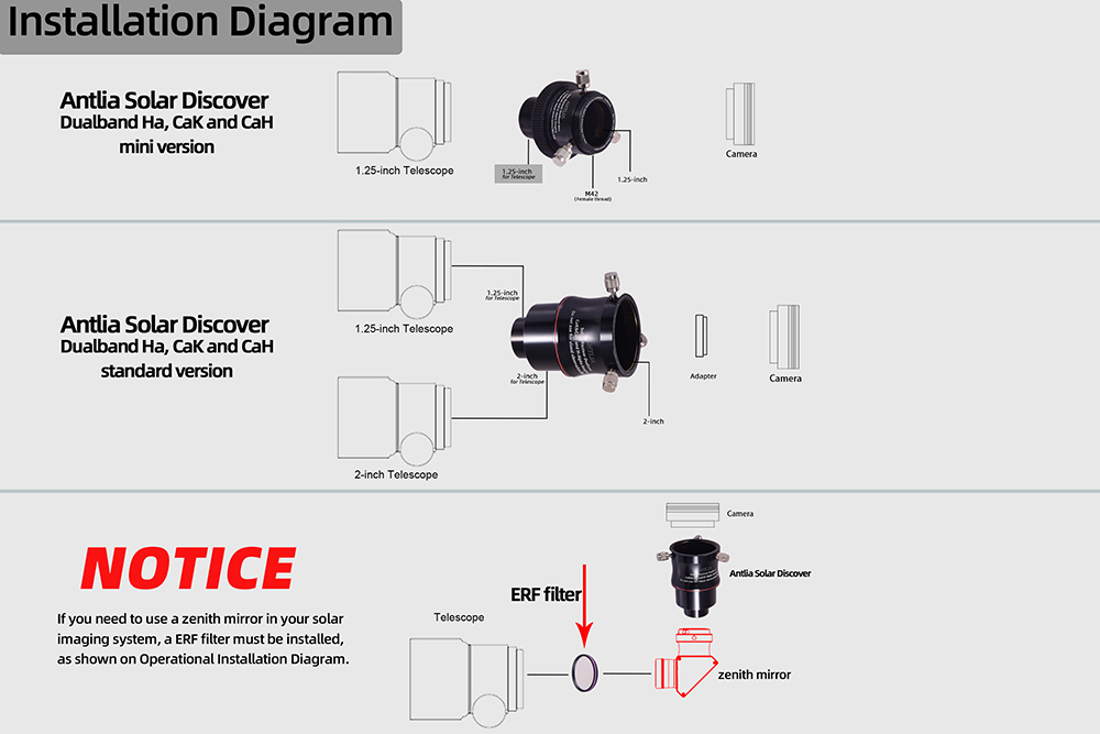 L' Antlia Solar Discover Dualband (Ha, CaK and CaH) è disponibile nella versione standard da 2" e in quella mini da 1,25". E' stato studiato per la fotografia della fotosfera solare, aumentando efficacemente l'incisione e il contrasto nella ripresa. Il risultato è una migliore visibilità dei dettagli sulla superficie, delle macchie solare ed un elevato contrasto sulla facole solari.