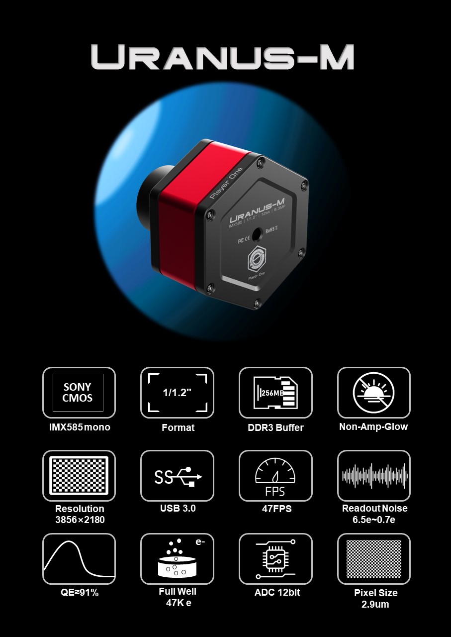 La Uranus-M è una camera progettata da Player One Astronomy che utilizza il nuovissimo sensore a colori Sony Starvis BSI IMX585 da 1/1,2" . Il pixel da 2,9 micron ha una Full Well Capacity di 47Ke con un totale di 8,3MP (la risoluzione è 3856x2180) e la diagonale è di 12,85mm.