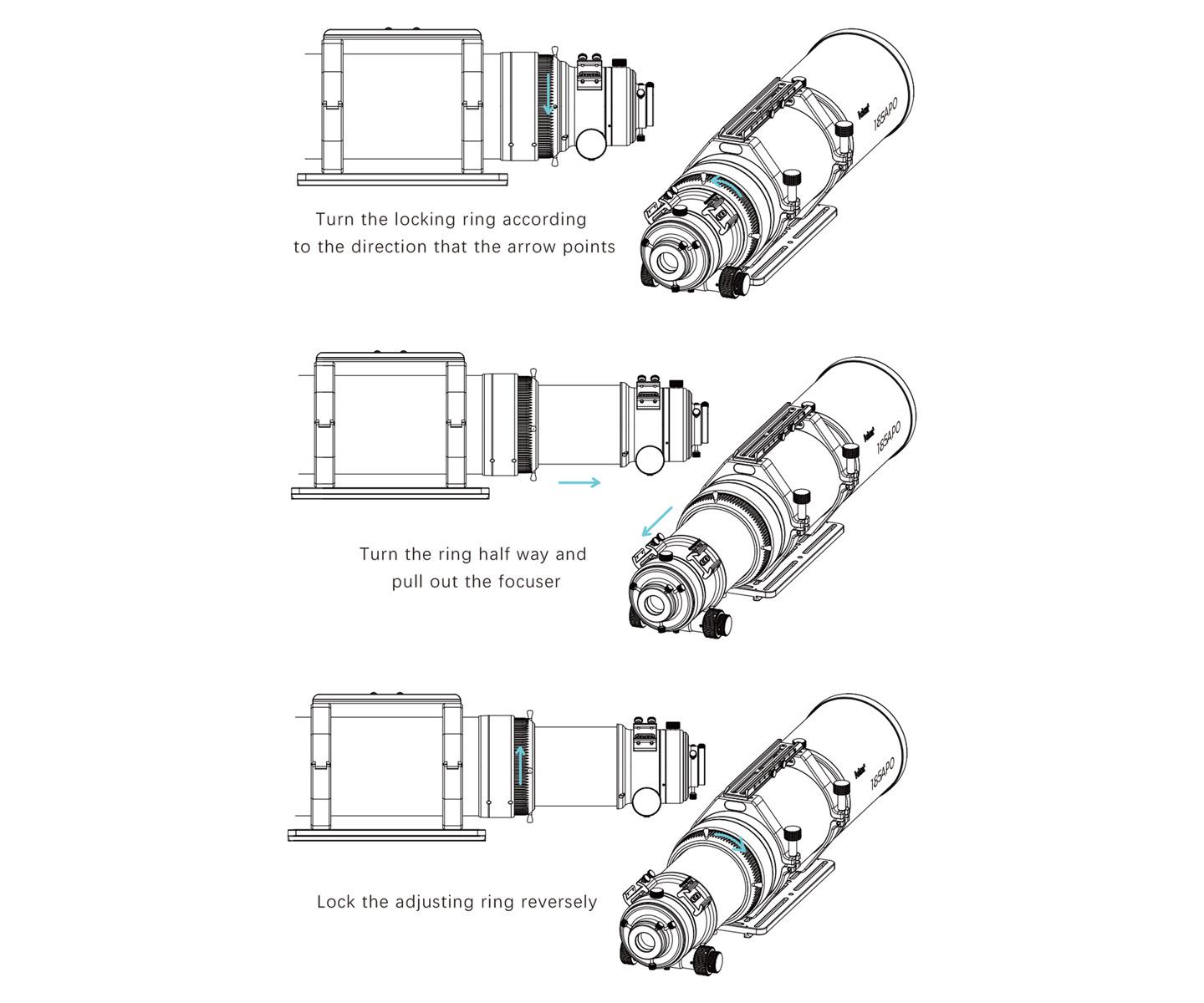 Quando il tubo è contratto, l'Askar 185APO può essere utilizzato con un binoviewer per l'osservazione visiva. Quando il tubo è allungato, il 185APO può essere equipaggiato con un riduttore o flattener specifico per l'imaging, o un diagonale e un oculare per l'osservazione.