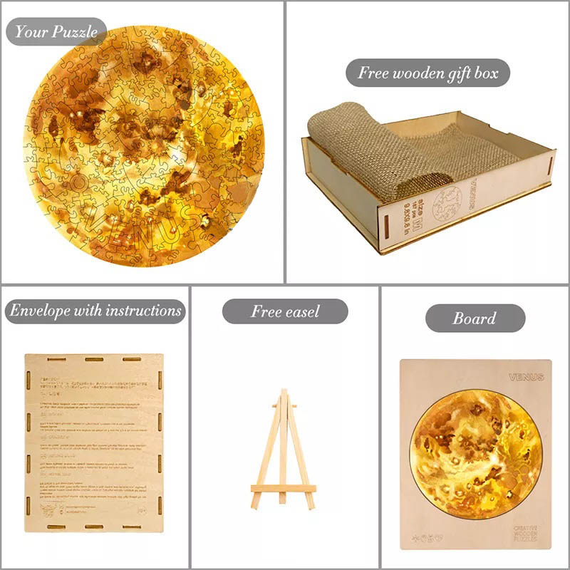 Il puzzle viene fornito con una elegante scatola in legno, un sacchetto in tela, un supporto in legno con il disegno completo del puzzle