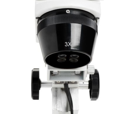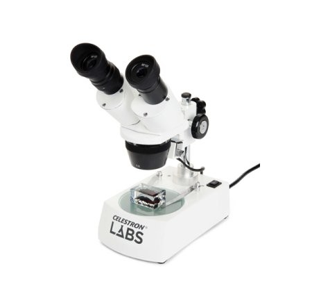 Stereo microscopio Celestron LABS S10-60 con testa inclinata a 45°, doppi oculari e due obiettivi.