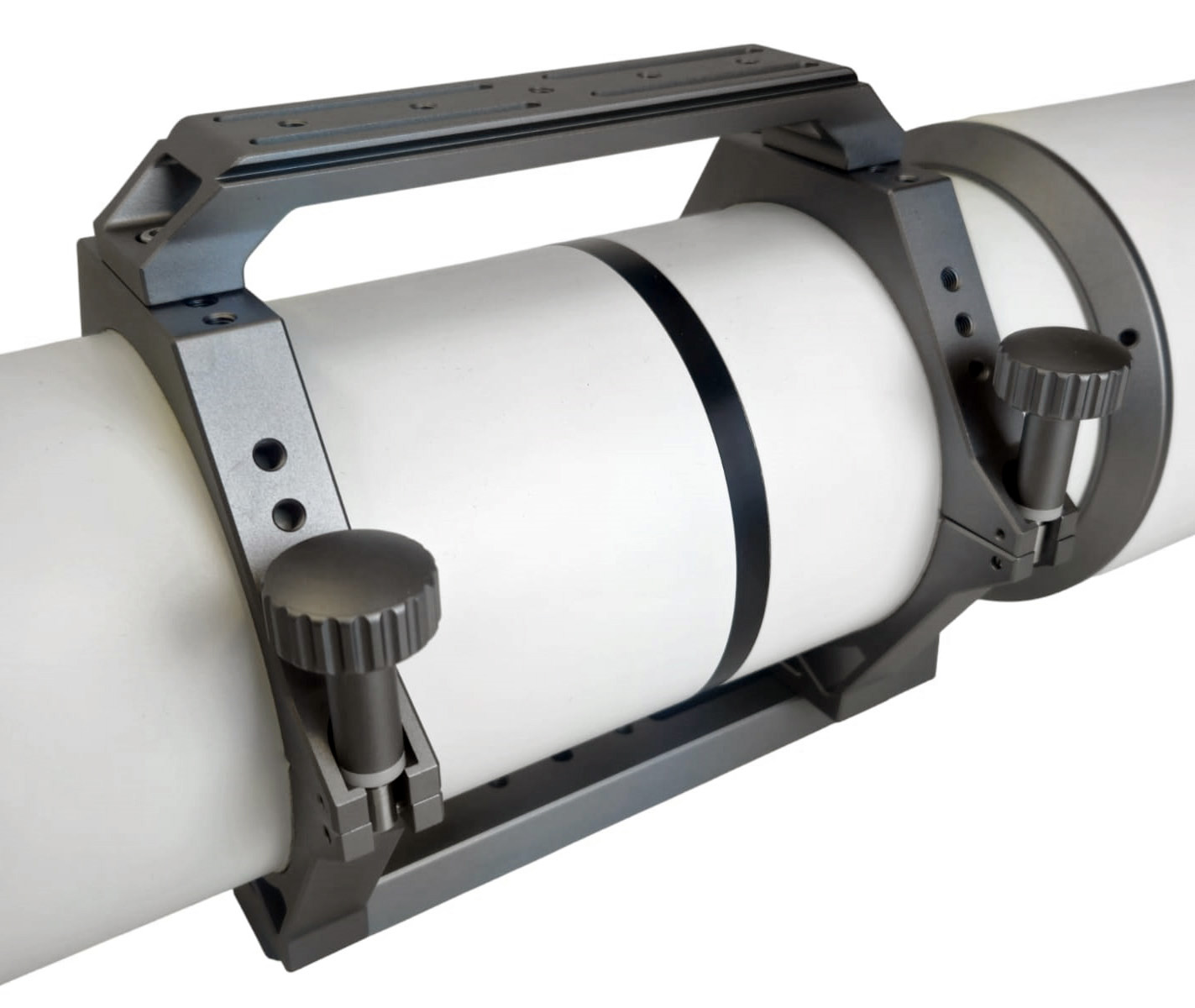 Anche gli anelli sono realizzati in CNC, robusti e raffinati permettono di montare anche lateralmente accessori per astronomia. Sono rialzati e consentono di far scorrere interamente il tubo senza il rischio di fa toccare le manopole di regolazione sulla lunga barra vixen in dotazione. La comoda maniglia che li collega ha un attacco Arka Swiss e numerosi fori filettati per collegare ,ad esempio, un telescopio guida.