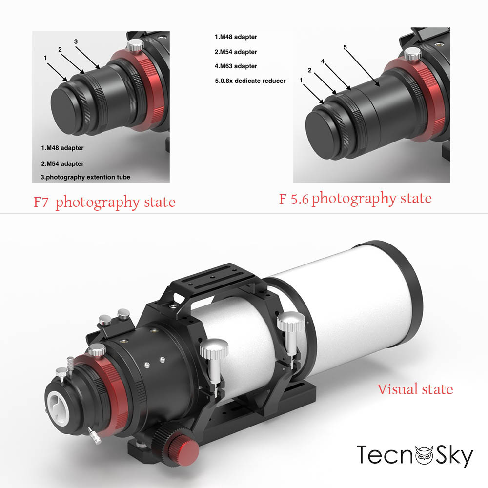 Grazie agli adattatori inclusi, il Tecnosky Quad Series è compatibile con oculari da 2" e 1,25", e offre anche opzioni di montaggio per fotocamere con tre filetti diversi: M48, M54 e M68, garantendo massima versatilità e compatibilità con una vasta gamma di accessori fotografici.
