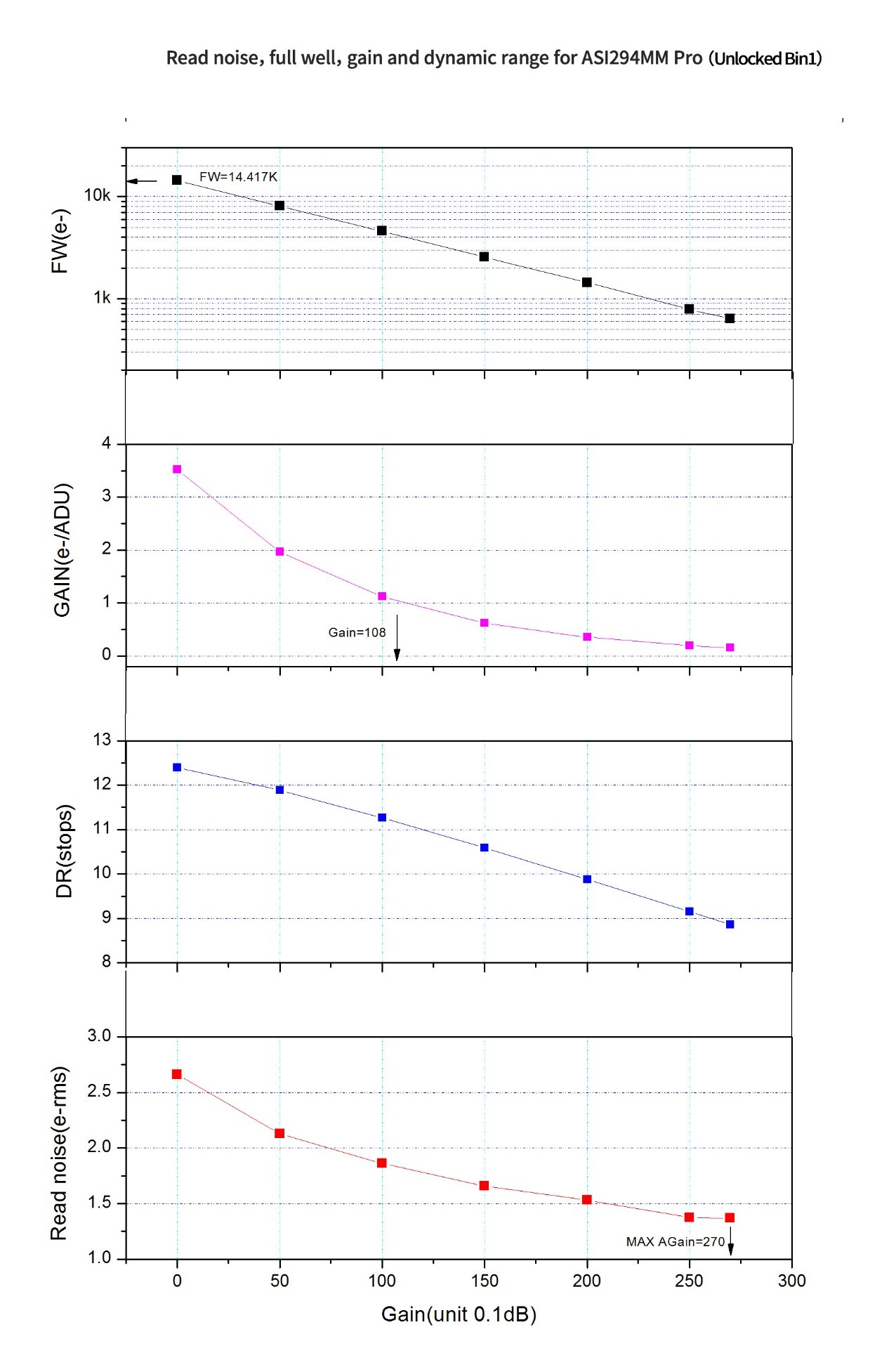 ASI294MM Pro ha parametri molto simili alla sua versione a colori. Entrambi hanno l'ADC a 14 bit e un'elevata gamma dinamica di 13 stop, che è persino superiore a quella della fotocamera ASI1600MM Pro.