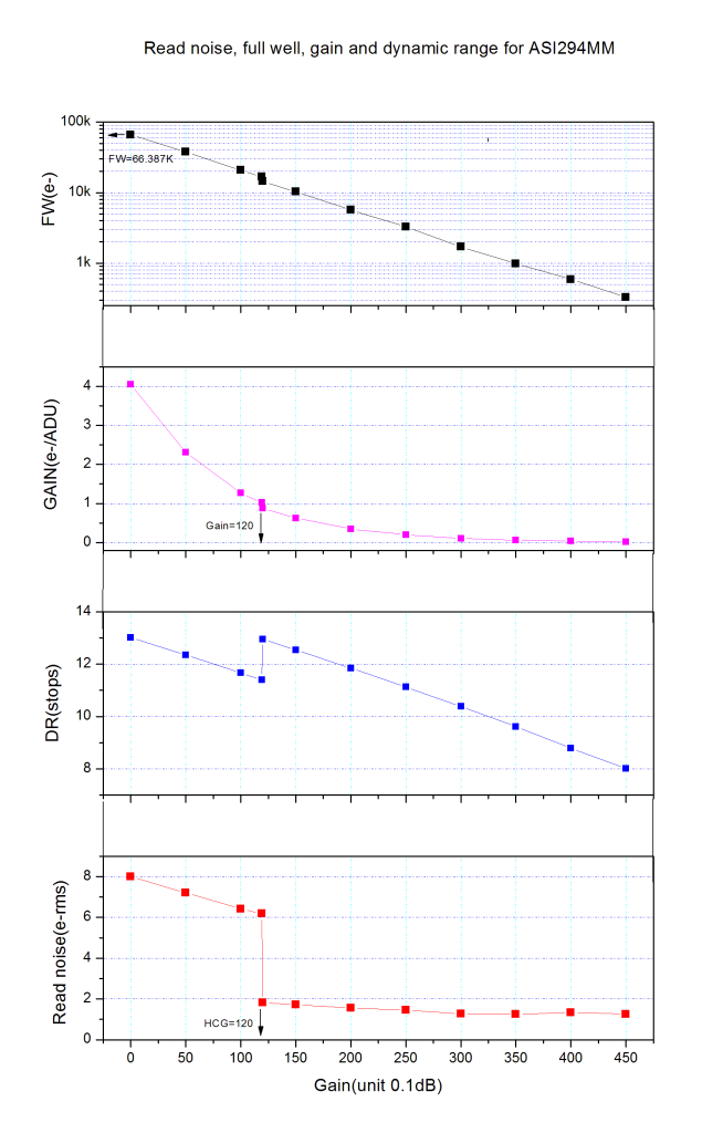 Quando il valore di guadagno è 120, la magica modalità ad alto guadagno HCG è attivata, il rumore di lettura sarà ampiamente ridotto (fino a 1.2e) e la gamma dinamica rimane sostanzialmente invariata.